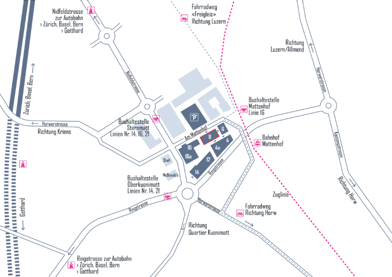 Von der Autobahn A2 kommend, nehmen Sie die Ausfahrt Luzern-Kriens. Folgen Sie der Beschilderung Richtung Kriens Zentrum / Mattenhof. Parkplätze für Autos, Velos und Motorräder befinden sich direkt vor Ort.